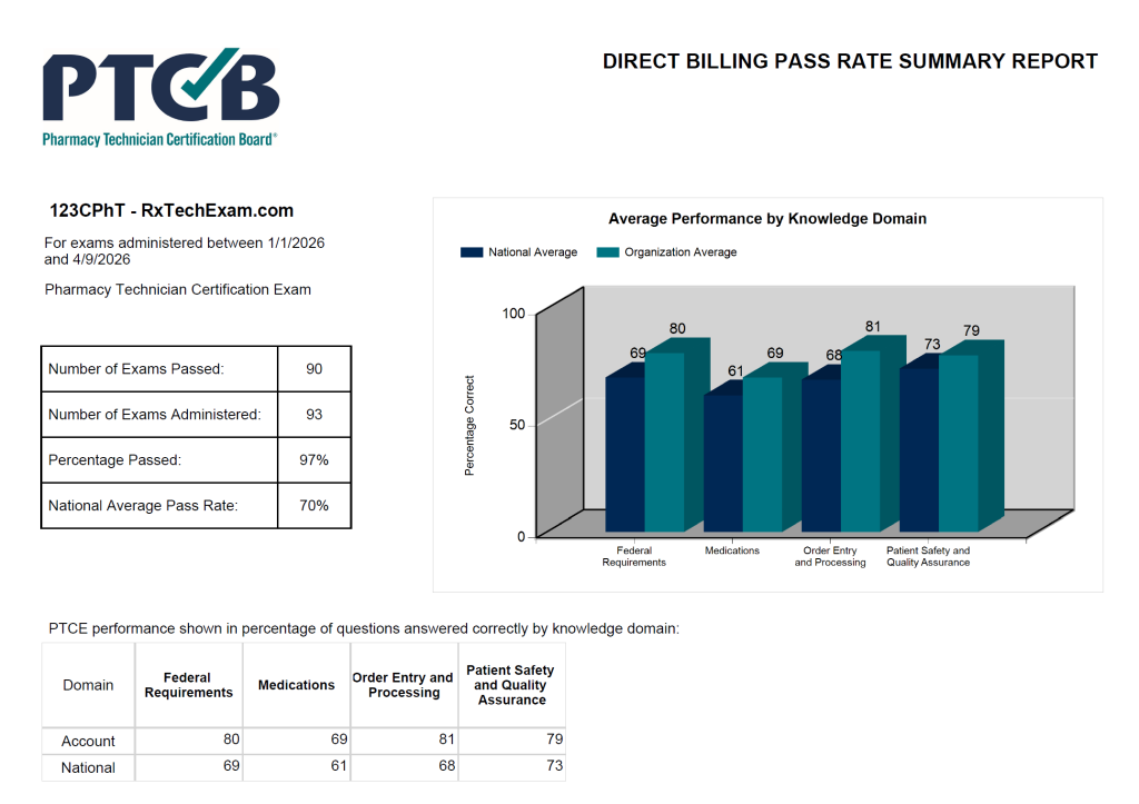 The 123CPhT course consists of 10 online modules, each with on-demand video, flash cards, practice quizzes, outlines, reference documents, one-page guides, and much, much more. After passing the Final Exam, and achieving a cumulative passing score, you are awarded our Certificate of Completion (prerequisite for the certification exam). More than 1300 RxTechExam students passed the Pharmacy Technician Certification Exam® (PTCE®) last year!